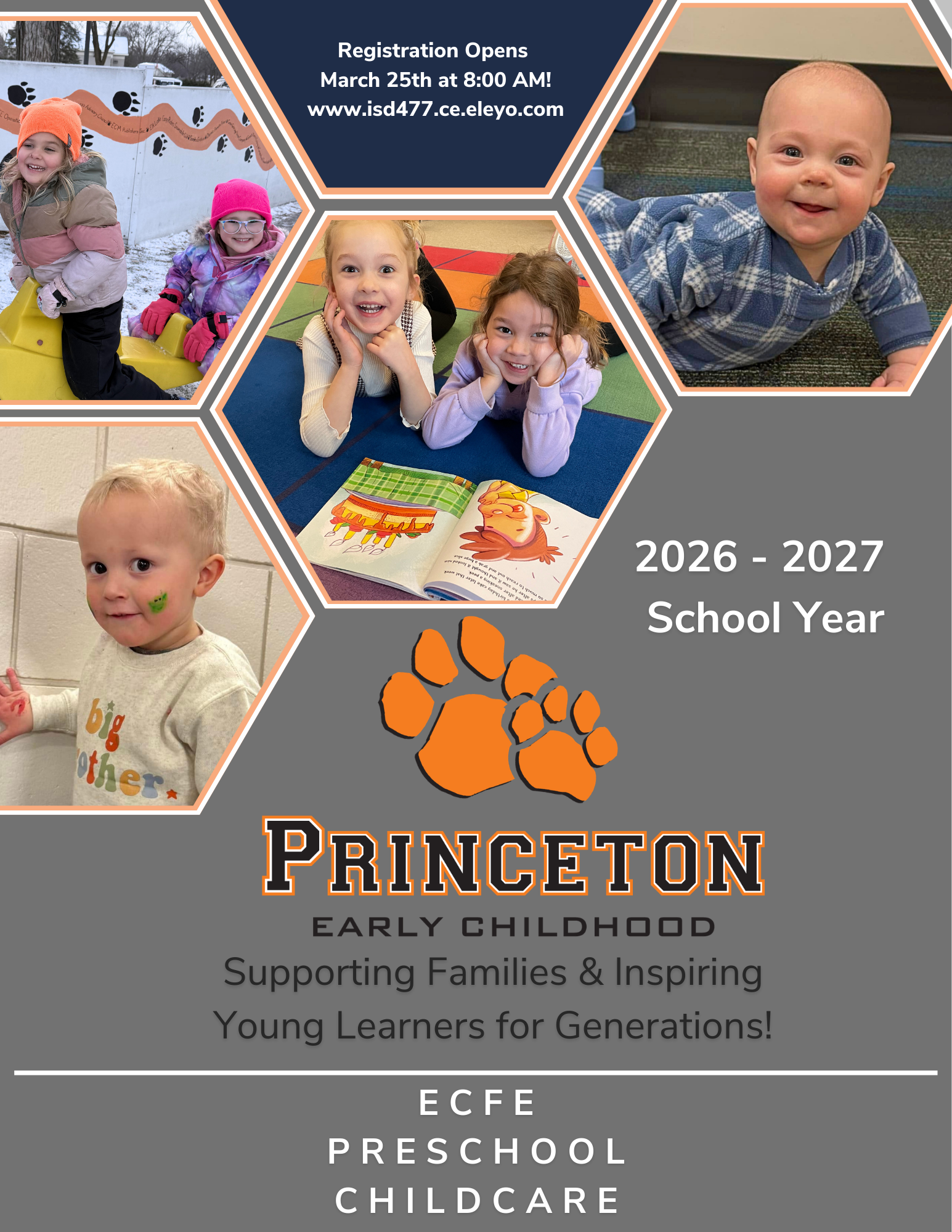 The 2026-2027 Princeton Public Schools Early Childhood Guide is your go-to resource for all things early learning! This guide provides families with essential information about our Hand in Hand Preschool, ECFE (Early Childhood Family Education) programs, Tiger Club wraparound childcare, and more. Inside, you'll find class offerings, schedules, registration details, and helpful resources to support your child’s growth and development. Whether you're exploring preschool options or looking for family education opportunities, this guide is designed to help you navigate the early years with confidence.